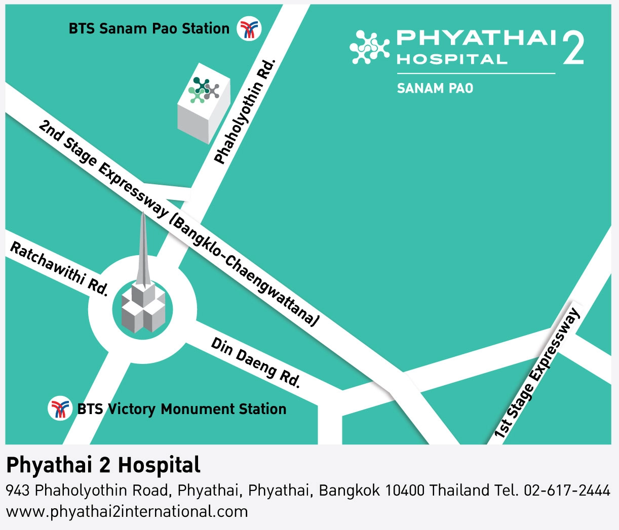 Phyathai 2 Hospital is located in Phyathai district, in the city of Bangkok near Victory Monument. Customers can also easily reach us via BTS sky train, get off at Sanampao station, take Exit no 1 then turn left and go straight for approximately 150 meters, the hospital will be on your right hand side.