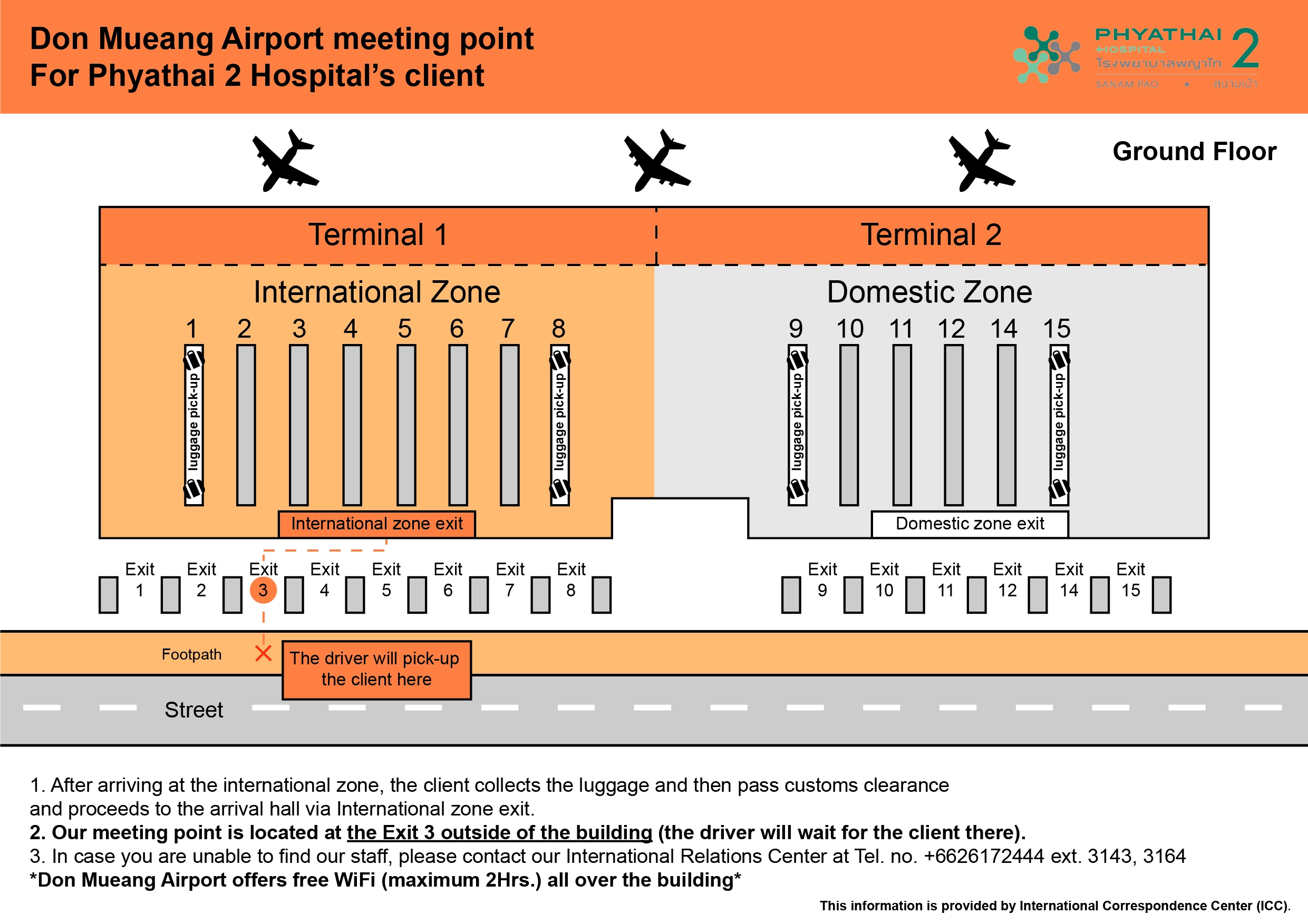 For your convenience, Phyathai 2 Hospital can arrange the transportation to pick up the patients and escorts from Suvarnabhumi airport or Don Mueang airport to either hotel or hospital. We also can arrange the pick-up from hotel to hospital or hotel to airport as well. To request for the pick-up, please make a booking at least one day in advance by providing details as follows: