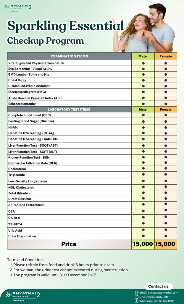 Sparkling Essential Check-up Program is suitable for indivual aged 20 and above, covering thorough consultation with expert doctors, blood test :CBC, blood sugar levels, and cholesterol profile, kidney & liver function tests, urine exam, heart health