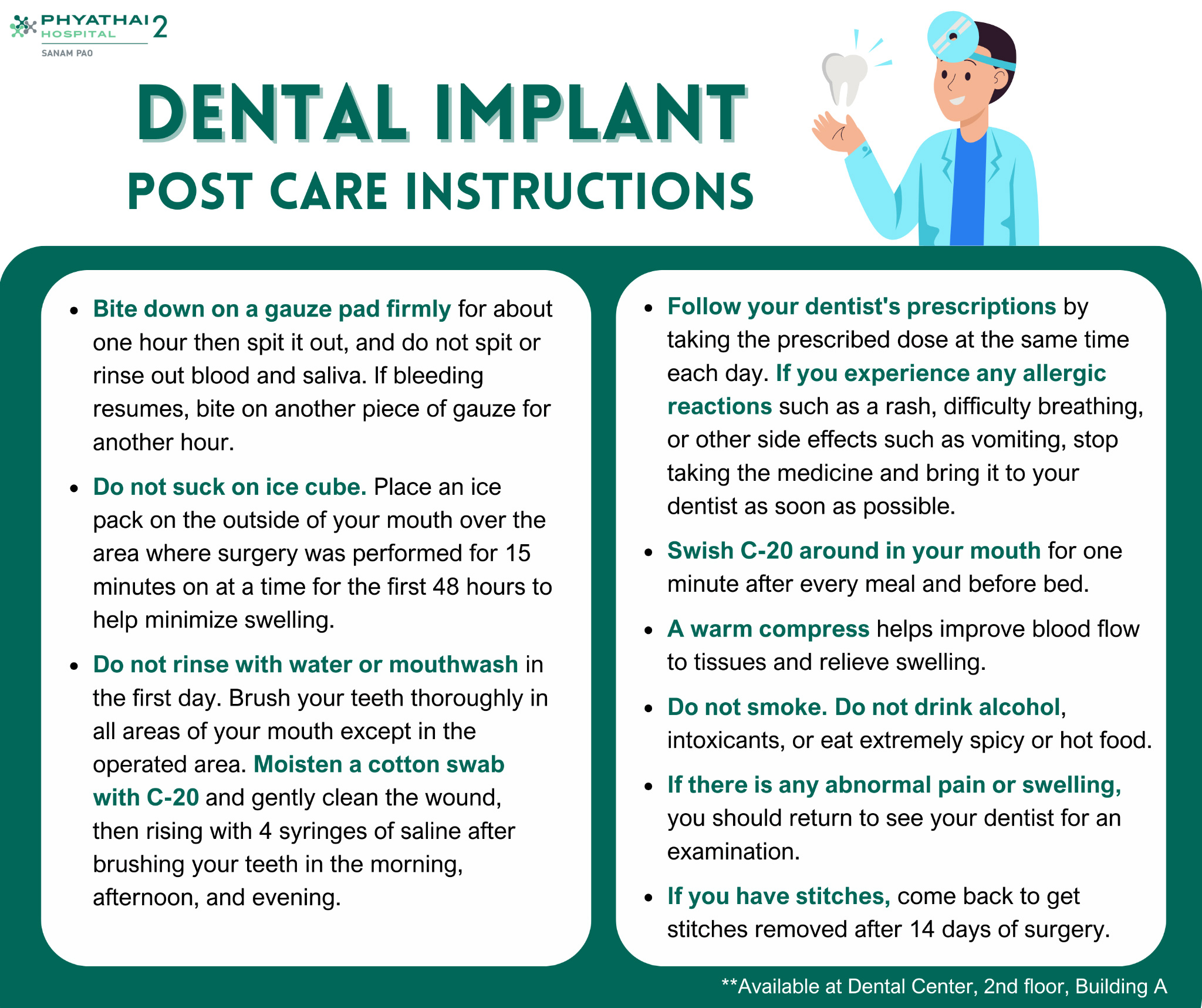 It is important to pay special attention to cleaning the implant area and the surrounding gums after dental implantation. Using dental floss is recommended to effectively remove food debris. Regular dental check-ups should be conducted at least twice a year.